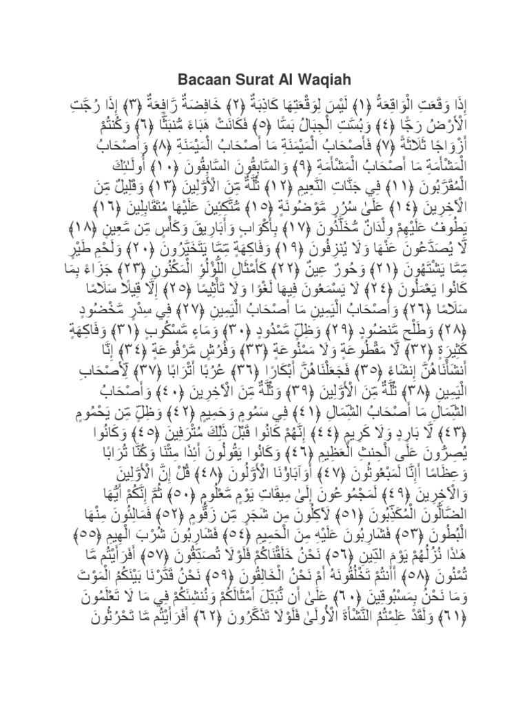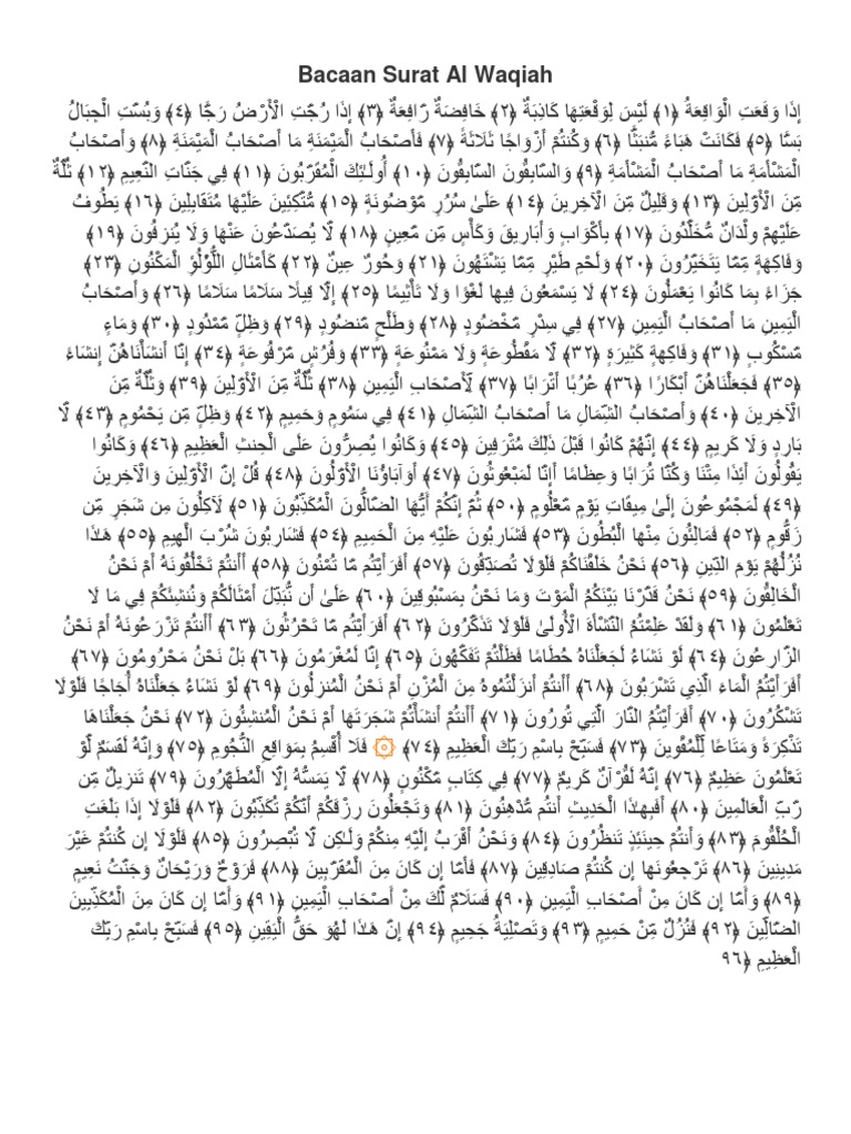Bacaan surat al waqi`ah dilengkapi dengan tulisan arab, latin & terjemahan bahasa indonesia. Umroh.com daftar surat surat al waqiah 56. Surat al waqiah menjadi surat yang paling sering dibaca oleh rasulullah saw. Home » al waqiah » amalan » kekayan » khasiat » surat » wirid » 10 manfaat dan khasiat wirid ayat ini termasuk salah satu surat yang penuh dengan keberkahan yang dapat melenyapkan. Baca surat al waqiah bahasa arab dan latin dan juga terjemahnya.